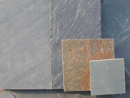 板岩,正面是自然面,背面磨平。厚度12-14毫米。板面平整,板质结实。常用于铺地面,墙面。